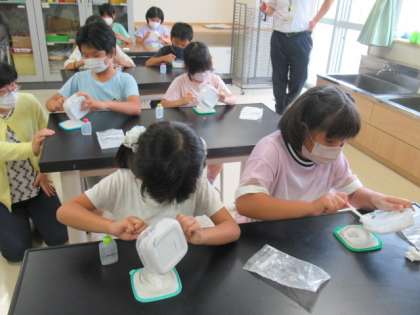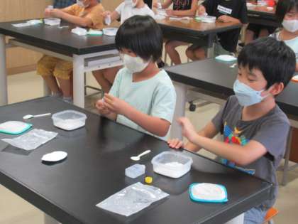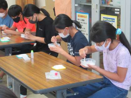 南極づくり4 公開日 2022/07/04 更新日 2022/07/04 学校風景 実際に体験をして、上手に作るには、すばやく均等に石膏と水を混ぜることが大事だということが分かりました。子供たちは、真剣に取り組んでいました。