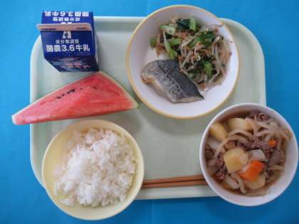 今日の給食は、ごはん、牛乳、肉じゃが、さわらのしおやき、いりだいずあえ、すいかです。すいかを食べると夏本番を感じます。