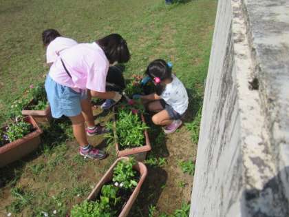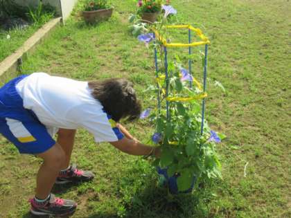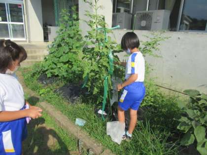 生き物の成長に感動 公開日 2022/07/08 更新日 2022/07/08 学校風景 1・2年生では、育てているアサガオや野菜が大きく生長してきました。「アサガオ、きれいな花がさいている」ととてもうれしそうでした。野菜も大きく実っていますが、トマトが鳥に食べられており、その対策に取り組んでいました。植物の生長に心動かされ、活動にうつしている子供たちです。