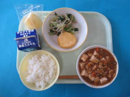 今日の給食は、ごはん、牛乳、マーボー豆腐、かにたま、ナムル、れいとうリンゴです。マーボー豆腐は、赤みそがかくし味となっており、みその風味も味わいました。