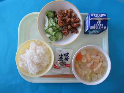 今日の給食は、ごはん、牛乳、ごもくみそしる、ぶたにくとひよこまめのあまからめ、そえやさい、あじつけござかなです。「あまからめ、とってもおいしい」と大盛りで食べている子供たちでした。