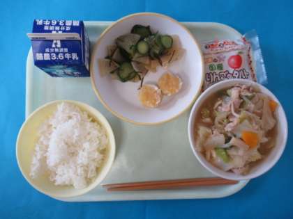 今日の給食は、ごはん、牛乳、かんこくふうすきやき、にんじんシューマイ、こんぶあえです。4〜7月に誕生日の人は、りんごのタルトがつきます。