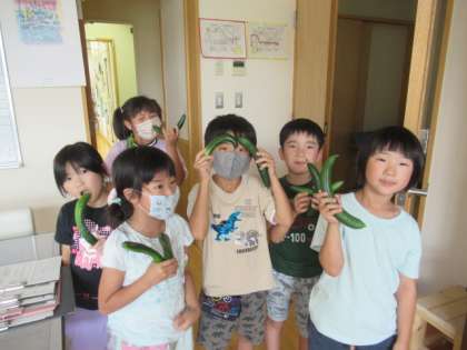 子供たちの育てている野菜が大きくなり、毎日収獲を喜び合っている子供たちです。今日は、10本のきゅうりがとれ、みんなでなかよく分けました。持ち帰りましたので、家族みなさんで食べてください。
