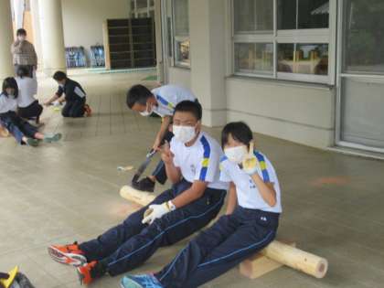 チームで丸太を抑え、協力し合いました。