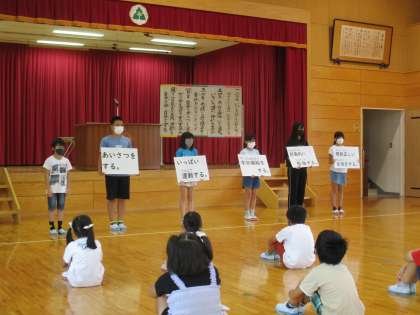 児童代表が、夏休みの過ごし方について発表しました。合い言葉は、「アイスケーキ」です。