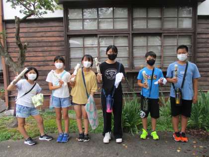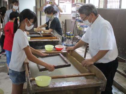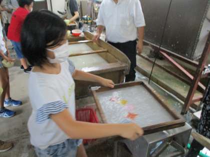 午後からは桂樹舎で紙すき体験を行いました。あらかじめ用意された紙細工を選び、オリジナルの和紙を作りました。最後はみんなで出来上がった和紙を手に記念写真です。楽しい活動をいくつも体験することができた集いとなりました。