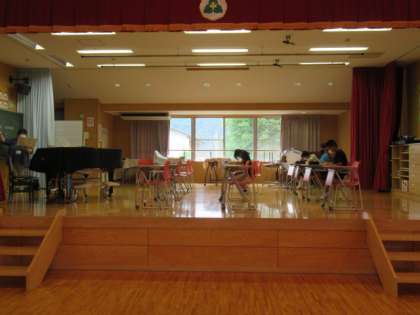 音楽の授業では、壁をオープンにして換気しながら取り組んでいます。