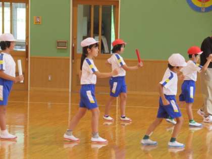 体育では、どうやったら速く走れるか、子供たちは手の振りを考えて、練習しました。