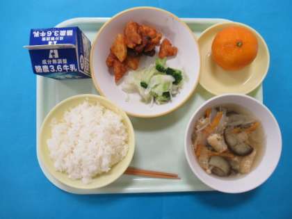 今日の給食は、ごはん、牛乳、なすのみそしる、とりにくとレバーのケチャップがらめ、そえやさい、冷凍みかんです。レバーはかりかりに揚げられており、おいしくいただきました。
