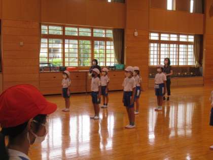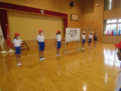 その後、5・6年生の応援団が自己紹介をしました。運動会に向けて、がんばるぞ、という思いが高まりました。