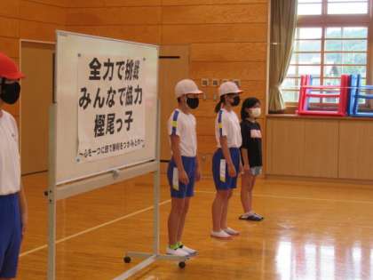 結団式では、5・6年生が運動会のスローガンを発表しました。今年のスローガンは「全力で挑戦 みんなで協力 樫尾っ子 〜心を一つに 団で勝利をつかみ取れ〜」です。
