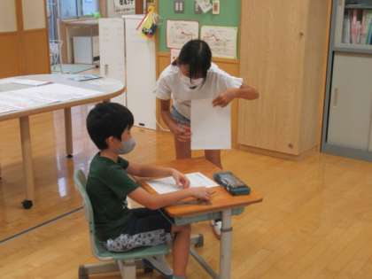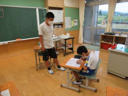 上の学年の子供たちのすてきなアドバイスがとても効いています。全校児童の絆を深めています。