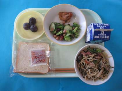 今日のメニューは、食パン、ベーコンとひじきのわふうスパゲッティ、ビーンズサラダ、いちごジャム、きょほうです。ひじきの入っているスパゲッティをおいしくいただきました。