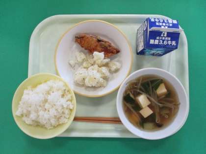 今日のメニューは、ごはん、さかなのりきゅうあげ、グリーンポテト、とうふスープです。