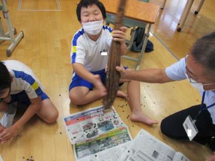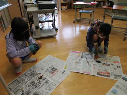 4年生は、へちまの実からたわしを作りました。実の中には、たくさんの種があり、その数におどろいていました。