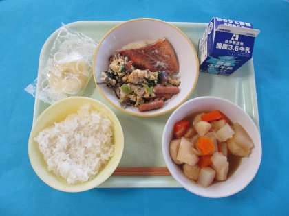 今日のメニューは、ごはん、たきあわせ、あかうおのしおやき、たまごときくらげのいためもの、れいとうパインです。