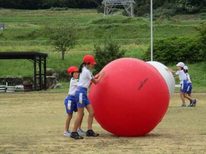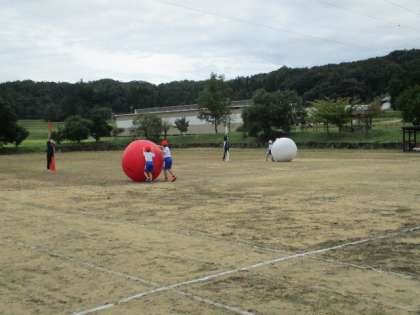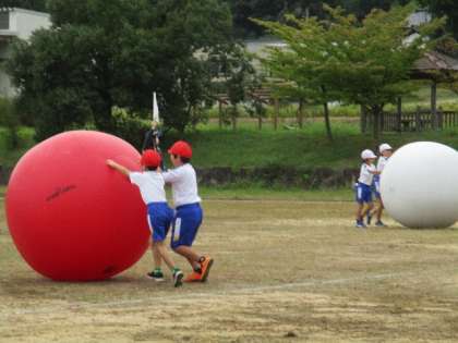 運動会では、保護者の皆様といっしょに行います。体よりも大きな玉を楽しそうに転がしていました。