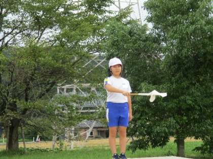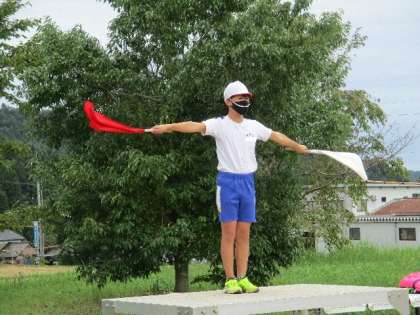 運動会の歌や校歌の指揮を行っています。全校の前で、堂々と行っています。