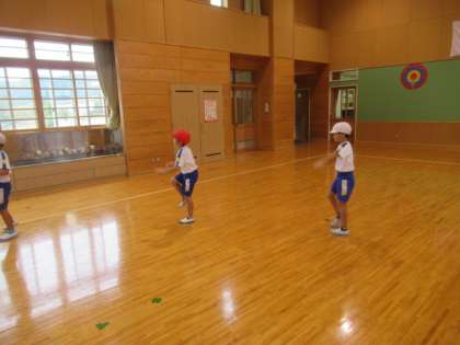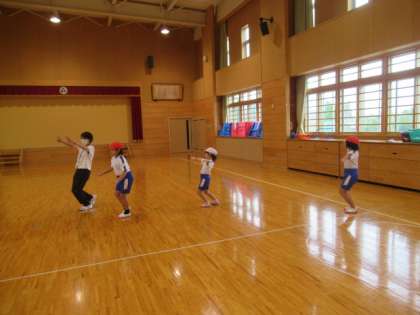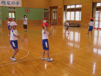 1〜3年生がおわら踊りの練習に取り組んでいます。手足の動きを確かめながら、がんばっています。