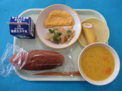 今日のメニューは、こくとうコッペパン、かぼちゃポタージュ、オムレツ、アスパラサラダ、バナナです。かぼちゃポタージュは、かぼちゃをしっかりと味わいました。