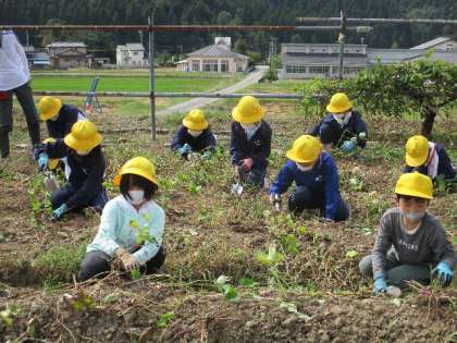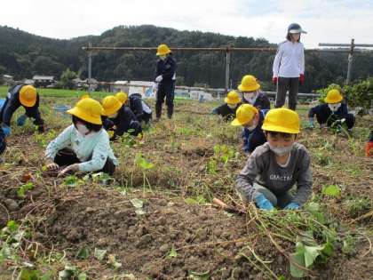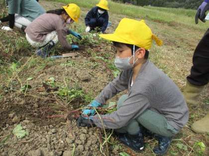 春に苗を植えたサツマイモの収穫を行いました。土を掘り返すと、続々とサツマイモが表れ、子供たちの歓声が畑に響きました。