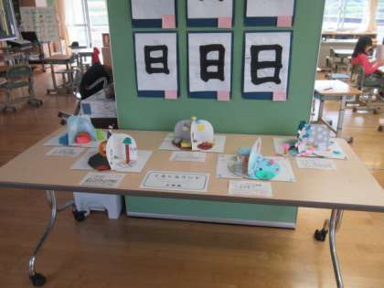 3年生が図工で作った「くるくるランド」が展示されています。子供たちの楽しい場面について、色合いや立体など工夫しながら表現しています。