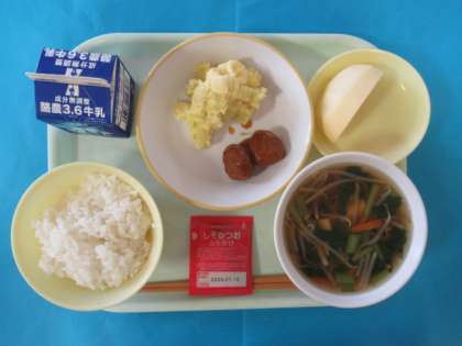 今日のメニューは、ごはん、牛乳、はるさめスープ、ミートボール、チーズおさつ、りんご、しそかつおふりかけです。チーズおさつは、さつまいもの適度な甘さがあり、とてもおいしかったです。