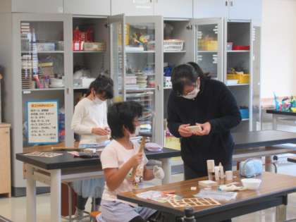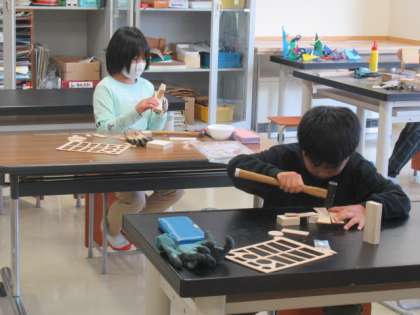 図工で、かなづちを使って、造形作品をつくています。かなづちを使うとき、とても集中していました。安全に気をつけながら取り組んでいます。