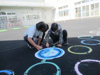 最後の輪っかに色をぬり、ケンケンコーナーが完成しました。