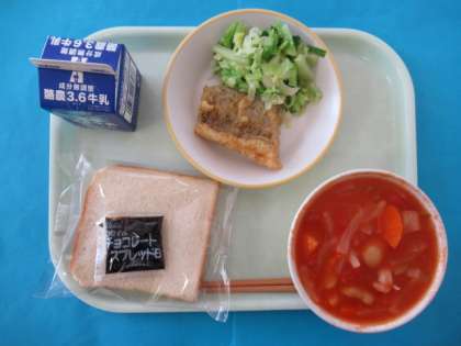 今日のメニューは、食パン、牛乳、まめとベーコンのトマトに、さかなのえごまあげ、そえやさい、チョコレートクリームです。トマトにの中のしろはなまめはとても大きく、食べ応えがありました。