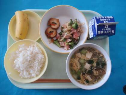 今日のメニューは、ごはん、たまごともずくのスープ、やさいのにくまき、きりぼしだいこんのペペロンチーノ、バナナです。つるっとしたもずくをおいしくいただきました。