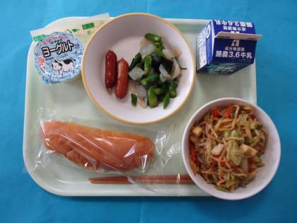 今日のメニューは、コッペパン、いかやきそば、あらびきウインナー、こんにゃくサラダ、ヨーグルト、牛乳です。やきそばのいい香りが教室に広がり、みんなでおいしくいただきました。