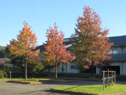 10月最終日、季節も進み、学校周辺の木々が色づいています。青空の下、色づいた葉がとてもきれいです。