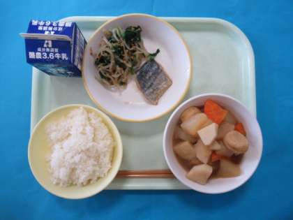 今日のメニューは、ごはん、牛乳、さわらのゆうあんやき、いりだいずあえ、おでんです。予行練習を終えほっとしながら、給食をいただきました。