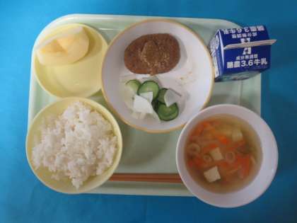 今日のメニューは、ごはん、牛乳、わふうにこみハンバーグ、きざみあえ、とうふのみそしる、りんごです。ハンバーグには、あまめのしょうゆだれがしみ、とてもおいしくいただきました。