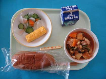 今日のメニューは、こくとうパン、たまごロール、だいこんサラダ、ポークビーンズ、ぼうチーズです。ポークビーズは、ごろごろの野菜、お肉がたくさん入っていました。