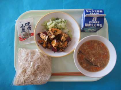今日のメニューは、ソフトめん、ソフトめんのにくみそ、だいがくいも、はなやさいサラダ、あじつけこざかなです。はなやさいサラダでは、ブロッコリーやカリフラワーなどしゃきしゃきの野菜をいただきました。