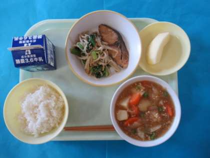 今日のメニューは、ごはん、牛乳、ふくらぎのさいきょうやき、こまつなのごまあえ、じゃがいものそぼろに、りんごです。旬のりんご、おいしくいただきました。