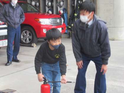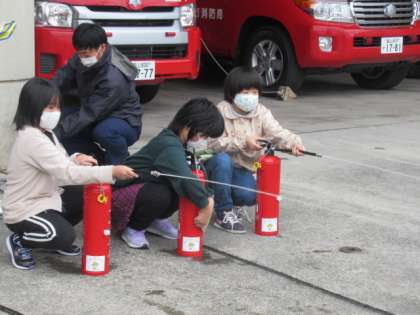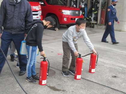 3・4年校外学習 その5 公開日 2022/11/17 更新日 2022/11/17 4年生 消防局の後半は、消化器の使い方を体験しました。本当に火が付いているところに水をかけました。真剣に消化器を使いました。