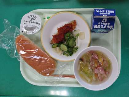 今日の給食は、こめこコッペパン、牛乳、しいらのイタリアンえごまソース、かぶのゆずサラダ、はくさいスープ、ラフランスヨーグルトです。