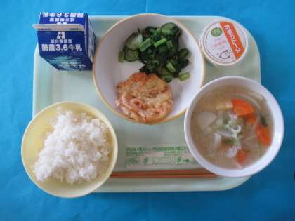 今日のメニューは、ごはん、牛乳、しろえびのかきあげ、こんぶあえ、とやまぶたじる、ふふふのおこめムースです。今日の給食は、「とやまの日」です。富山にちなんだ食品が使われています。何種類あったか、分かりますか?