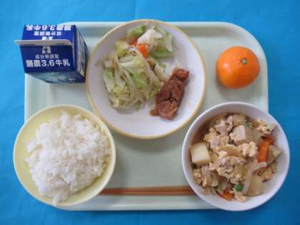 今日のメニューは、ごはん、てりやきチキン、やさいソテー、たまごとじ、みかんです。みかんは、とてもあまく、冬の近づきを感じました。