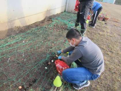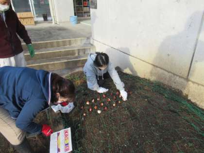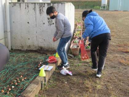 来春に向けて、本日全校児童でチューリップの球根を植えました。子供たちが、ある文字になるよう、色を考えて植えました。どんな文字になるか、春が楽しみです。