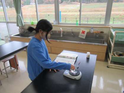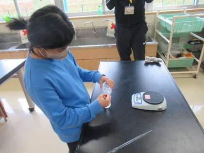 5年生では、もののとけ方について学習しています。この日は、ミョウバンが水にとけると重さはどう変わるか調べていました。水にとけると目に見えなくなりますが、重さはどうなるのでしょう?