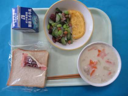 今日の給食は、食パン、牛乳、オムレツ、ミックスビーンズのマリネ、クリームに、メープルジャムです。くりーむにには、星型のにんじん、マリネには赤やみどりのマメがはいっており、12月らしさを感じました。