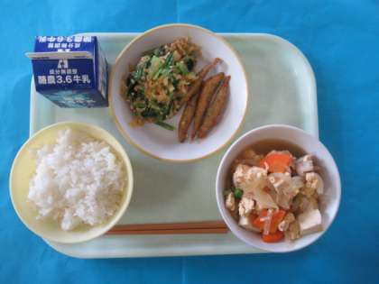 今日のメニューは、ごはん、牛乳、きびなごのからあげ、なっとうあえ、おやこにです。きびなごは頭から食べ、カルシウムもたっぷりです。