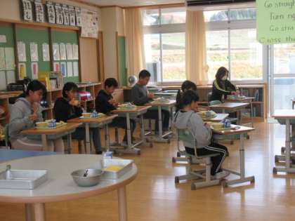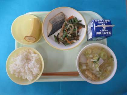 今日のメニューは、ごはん、牛乳、さわらのしおやき、くきわかめのきんぴら、ぐだくさんじるです。くきわかめがたっぷり入ったきんぴらは、食物せんいもたっぷりなことでしょう。