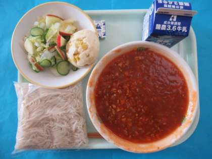今日のメニューは、ソフトめん、ミートソース、むしパン、はくさいとりんごのサラダ、ポケットチーズです。子供たちに大人気のソフトめん、とてもおいしそうにいただいていました。