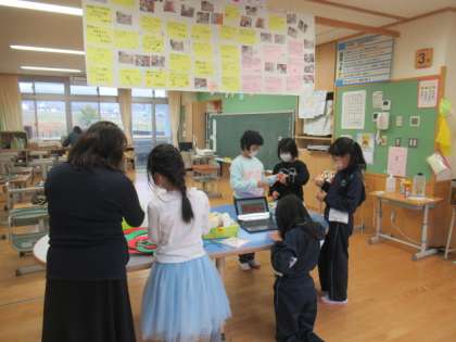 休み時間に、クリスマスツリーづくりに取り組みたい子供たちが集まりました。ツリーに付ける飾りを熱心に作っていました。