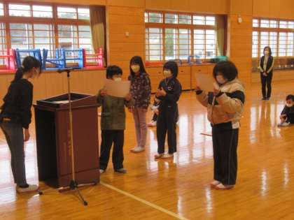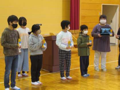 各委員会から、がんばった子供たちへの表彰式が行われました。運営・ブック委員会からは、読書キャンペーン中の冊数について、スポーツ・保健委員会からは、かしおフレンドパークの結果についてです。子供たちの手作りのすてきな表彰式でした。